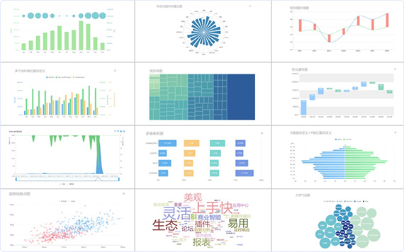 • 数十种的可视化图表效果,,包括柱形图、、折线图、、、雷达图、、散点图和词云图等,,,,满足不同人群的阅读偏好,,为您展示多样数据信息提供全面支持