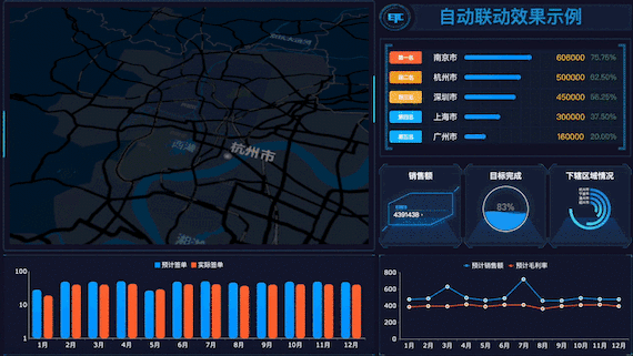 • 支持业务互动,,,包括不限层次的钻取、、多维度的联动分析、、轮播时自动联动其他组件等,,,,协助您更好的发现并分析业务问题