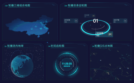 • 我们基于webgl等技术开发了大屏图表插件,,,通过简单拖拽即可实现自动播放、、、3D动画特效等多种效果;图表类型包括轮播三维组合地图、、、、轮播gis点地图、、、、流向地球、、、、时间齿轮和目录齿轮等,,科技感十足,,让大屏展示效果更加炫酷