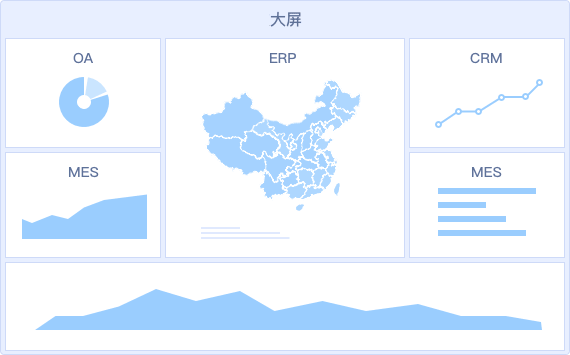 • 同一个大屏看板可以轻松整合ERP/OA/MES等多业务系统的数据,,打破信息孤岛,,,进行综合展示分析,,让决策更清晰