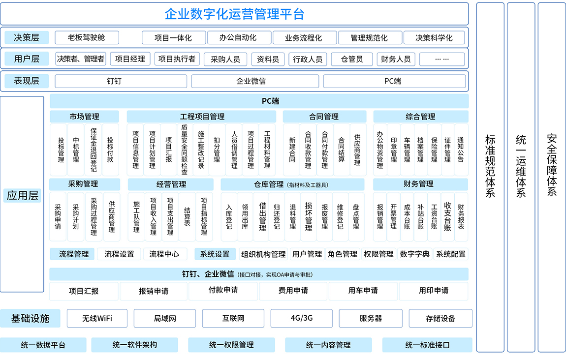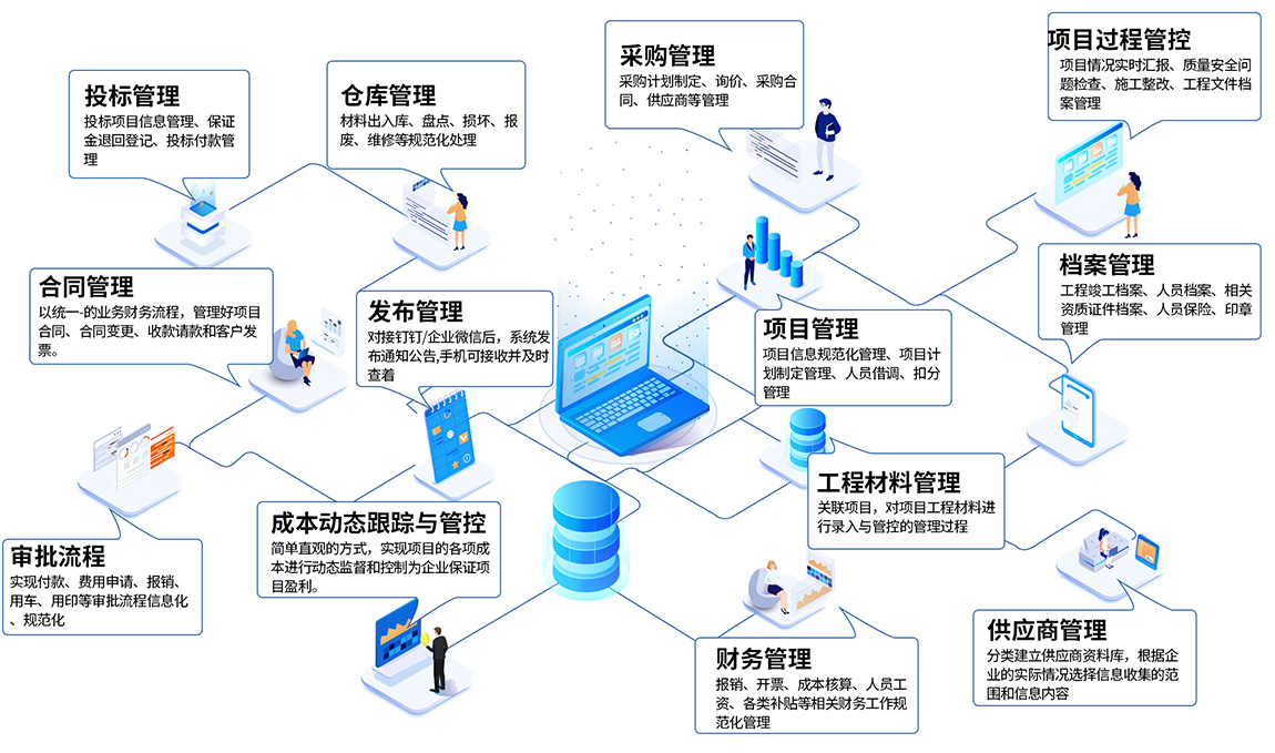 数字化管理系统对企业工程项目从项目投标中标、、、项目过程管理、、合同管理、、物资设备管理、、采购管理、、、、项目过程管理、、施工队管理、、、、供应商、、成本核算等进行全面综合管理;纵向贯穿投标、、、、采购、、、、施工、、、、竣工的全过程,,,,横向涉及公司内部的各相关岗位,,,,是一套全方位、、、、集成的企业项目综合管理平台。。。。通过对成本、、、进度、、、、质量、、、、安全等方面的控制,,以及对合同、、结算、、、、支付、、资金等要素的管理,,,来提高工程类企业对工程项目的综合配套能力。。。。